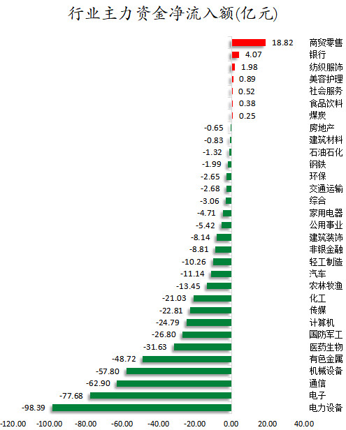 从行业来看,申万所属的31个一级行业,今日有7个行业主力资金呈现净流入,其中,商贸零售行业主力资金净流入最多,净流入金额为18.82亿元;行业主力资金净流入居前的还有银行、纺织服饰、美容护理等,净流入金额分别为4.07亿元、1.98亿元、0.89亿元。24个行业主力资金呈现净流出,其中,电力设备行业主力资金净流出最多,净流出金额为98.39亿元;行业主力资金净流出靠前的还有电子、通信、机械设备、有色金属、医药生物等,净流出金额分别为77.68亿元、62.9亿元、57.8亿元、48.72亿元、31.63亿元。