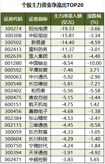 今日有3392只个股被主力资金净卖出,其中,143股被主力资金净卖出超1亿元。主力资金净流出最多的个股是阳光电源,净流出金额为19.33亿元;主力资金净流出居前的个股还有中际旭创、新易盛、雷科防务、雪人集团、中国铀业等,净流出金额分别为15.81亿元、14.4亿元、11.37亿元、8.61亿元、8.54亿元。