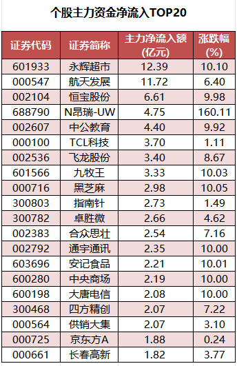 个股来看,今日(12月16日)有1767只个股获主力资金净流入,其中,53股获主力资金净流入超1亿元。永辉超市主力资金净流入最多,净流入金额为12.39亿元;主力资金净流入居前的个股还有航天发展、恒宝股份、N昂瑞-UW、中公教育、TCL科技等,净流入金额分别为11.72亿元、6.61亿元、4.75亿元、4.4亿元、3.7亿元。